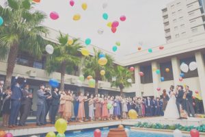 プールの中に一斉に風船を投げ入れると