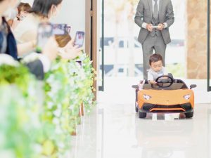 歩いての入場が難しい歳のお子様に参加頂くのにピッタリの演出ですね♪