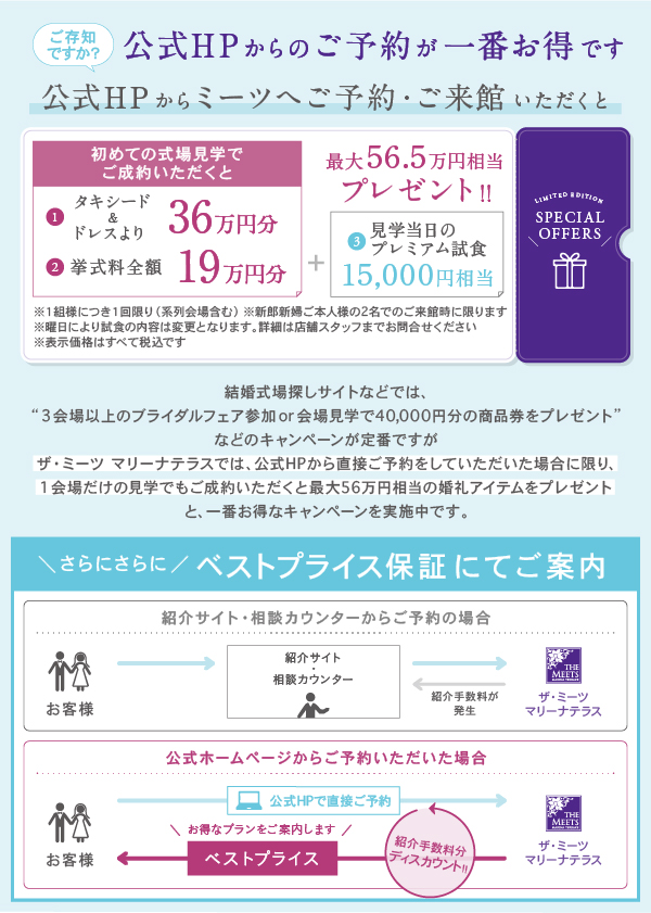 他の式場紹介サイトや式場紹介デスク・相談カウンター経由にてご予約をいただく場合よりも