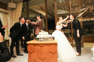 新郎新婦様がお互いにケーキを食べさせ合うシーンですが、新郎様から新婦様には”一生食べ物に困らせません”