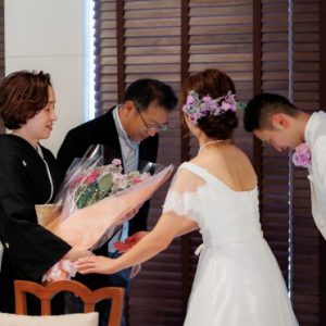 結びにご両家の親御様に感謝の花束をお渡ししました。