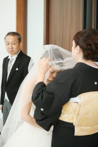 お母様が新婦様のベールをおろすことで、ウエディングドレスの
