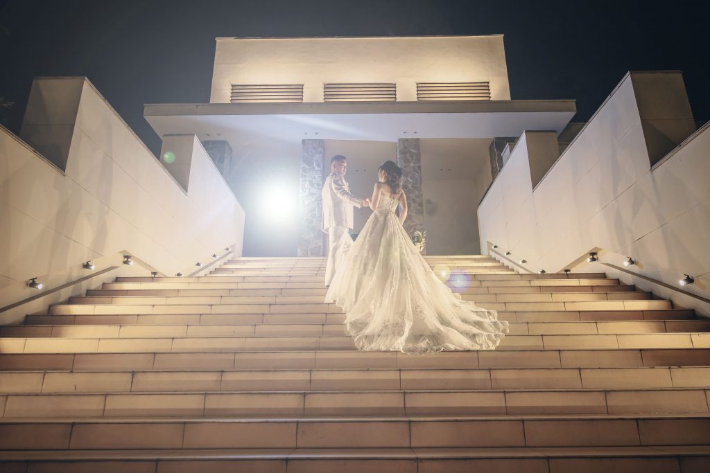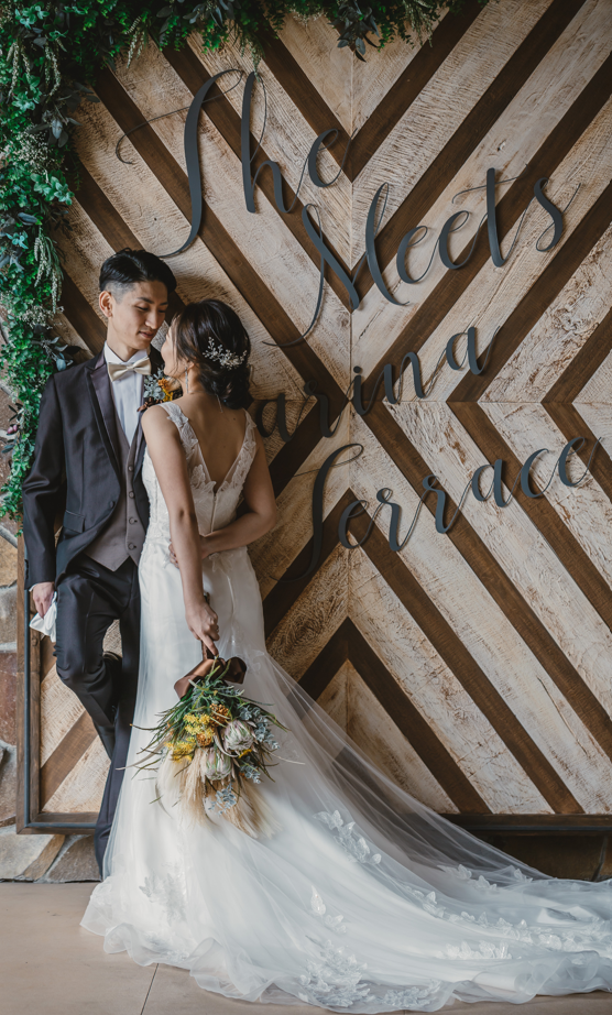 披露宴会場のテラスを使って大人オシャレにシックなお写真も!