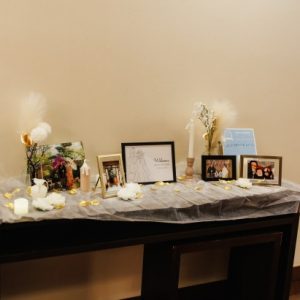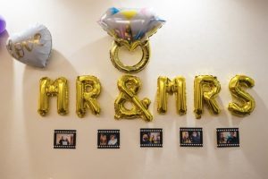 ホワイエスペースには前撮りのお写真やふたりの想い出の写真を使って