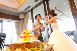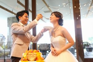 ケーキ入刀をして新郎新婦様がお互いにケーキを食べさせ合うシーン