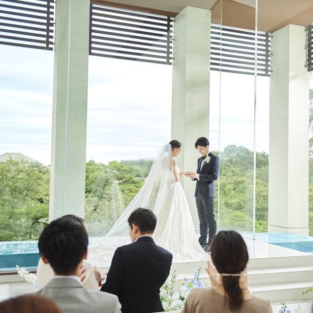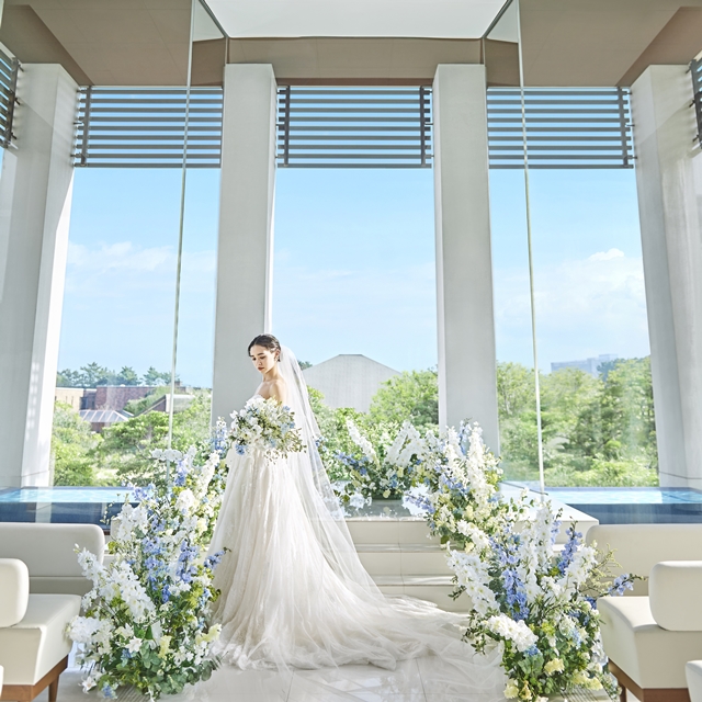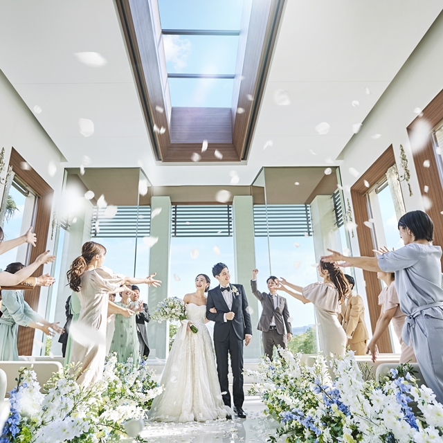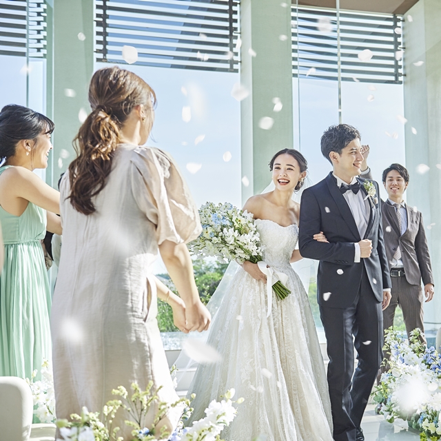一歩足を踏み入れた瞬間、青空と豊かな緑の木々が広がるザ・ミーツ マリーナテラスのチャペル。ガラス張りの開放的な空間での挙式から、まばゆい光に包まれる大階段でのアフターセレモニーまで、おふたりとゲストの心に深く刻まれる感動のシーンが叶えられます。
