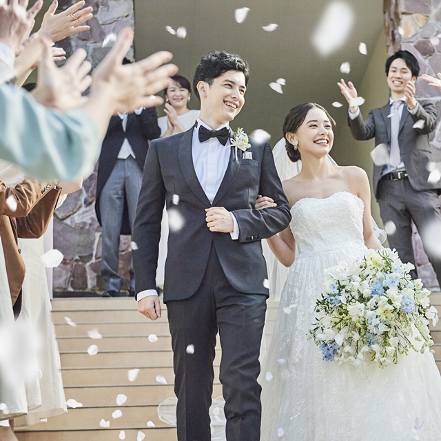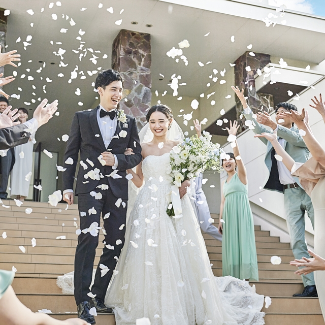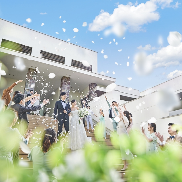 神聖な挙式の後は、爽やかな陽射しがあふれる大階段を舞台にしたアフターセレモニーを。フラワーシャワーやブーケトス、バルーンスパークなど、青空を彩る演出の数々はまるで映画のワンシーンのよう。ゲストの皆さまと、笑顔に満ちた晴れやかなひと時をお過ごしください。