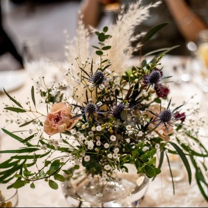 衣装に合うようにテーブルクロス、ナフキン、ペーパーアイテム、装花を考えました。