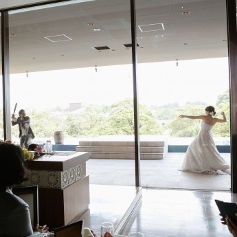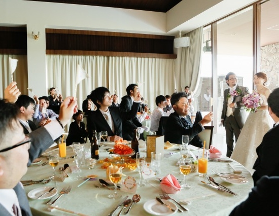 どうしてもやりたかったのがモーションカーテン!!野球選手の登場のようなオープニングムービーを作成していただきました。球場に入っていく雰囲気に続いて選手紹介っぽく主賓や新郎、新婦を紹介するという細かい注文をかなえてくれるムービーでした。また、私がうぐいす嬢風に新郎・新婦を紹介した音声も入れていただけ、オリジナリティ満載になりました。ムービーが終わってカーテンが開くとテラスに私たちが!!ゲストの方々は驚いてくれました。