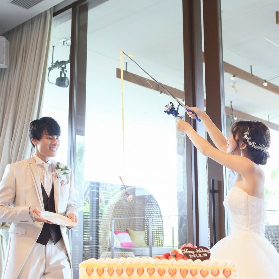 おたのしみBOXは釣り竿を準備しており、新郎へのファーストバイトは釣り竿で行いました!