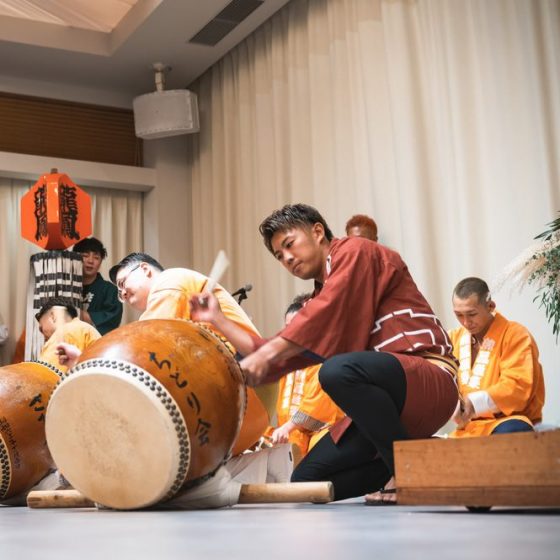 2つ目は、新郎側の余興です。ゲストの方々に夏を感じてもらえるように鳴り物や纏を行いました。デザートビュッフェをテラスで楽しみながら羽太鼓を見たりとお祭り気分を味わえるような演出をしました。