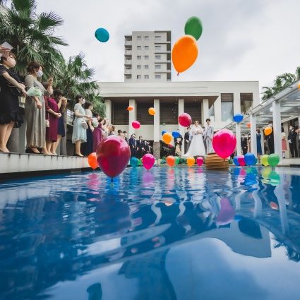 私たちだけじゃなく、参列してくれた皆様にも楽しんで貰いたい気持ちが強く、ブーケトスも3つに分散したり、ミーツならではのバルーン演出、ドレスの色当て、各卓フォトラウンド、サンキューバイトなど様々なものを取り入れました。