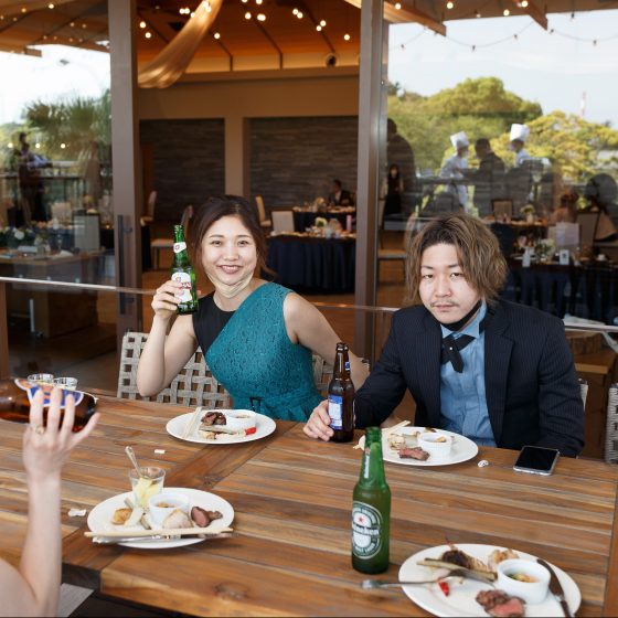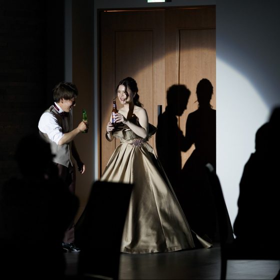 扉が開いたあと新郎がカクテルを振りながら入場し、それを新婦にプレゼント。しかしビール好きの新婦はカクテルを受け取らずビールに変えてもらい2人で乾杯!!