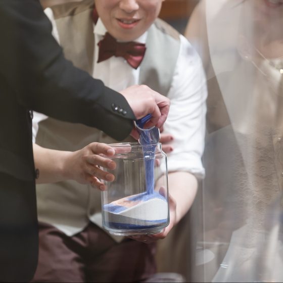 ドロップ&フライや披露宴中にくじ引き型のサプライズインタビュー、各卓ラウンドをしながら砂を入れてもらったサンドセレモニーなどゲストも一緒に楽しめる参加型の余興を考えました。