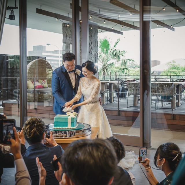 和菓子を入れてもらったり、ウェディングケーキもブランドカラーを