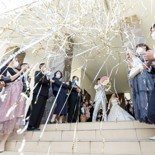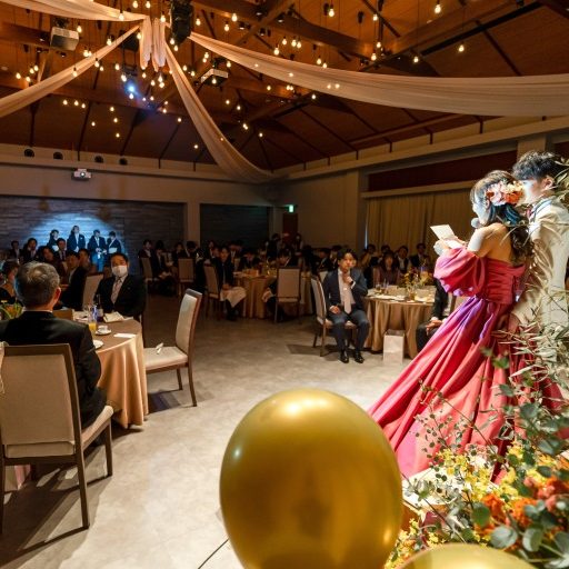 挙式の入場前にスイッチングレターをしました。一人一人に手紙を書き、私たちがチャペルに入場する前に一斉に読んでもらうことで温かい雰囲気を作ることができました。ゲスト一人一人と話す時間は十分にとれないので、手紙に伝えたい思いを込めました。挙式後は大階段でビッグクラッカーをしました。ゲストの驚いている顔や楽しんでいる顔が鮮明に蘇ってきます。その後アクアテラスでバルーンスパークをやりました。本当はドロップアンドフライをやりたかったのですが、内戦の影響でヘリウムガスが手に入らないとのことだったため、ヘリウムガスが無くてもできることをプランナーさんが提案してくれました。ボタンを自分たちで5つ用意し、ゲストの方々を5人指名し順番にボタンを押してもらい、当たりを引いたら割れるというように行いました。いつ割れるかわからないドキドキ感をゲストの方々に楽しんでいただけたと思います。披露宴では入場後、席札でもあり、引き出物でもある世界で一つだけのカップを一斉にオープンしました。金色のカップが出たお二方には乾杯の時に前に出てきてもらい、おもてなしの気持ちを込めて、私たちが直接乾杯ドリンクを注ぎ、一緒に乾杯をしました。