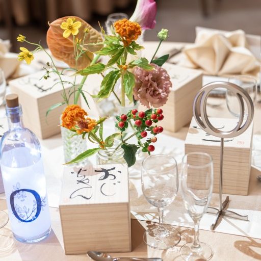お料理は全てシェフと食材や盛り付け方法などを1から考えることができました。・ブーケに見立てた魚介類のタルタル いくらやカニ、ホタテを使っています。「感謝」をテーマに花束をイメージしてもらいました。・真鯛のマリネと色彩野菜 紫玉葱ヴィネグレット ミモザ風 食べやすさと味重視で、ジュレやムースを使わないでもらいました。・オマール海老のソテー ソースアメリケーヌ ○○○のパスタ オマール海老を1匹使っていただき、ゲストからも好評でした。そして給食のABCスープをイメージしてABCパスタを使ってもらいました。アルファベットで名前を作ってくれたゲストもいて楽しんでくれたことが嬉しかったです。・平目と帆立のムースのカダイフ焼き ノアリー酒のソース 変化が欲しかったので、サクサク感を出してもらいました。珍しくもあり、食べやすくもあり、喜んでもらえました!・和牛フィレ肉とロース肉のグリエ 赤ワインのソースとトリュフ塩 これは食べ比べをしてもらいたくて2種類のお肉を使いました。「味付けも最高!」「今までの結婚式のお肉で最高級!」とゲストから好評でした。お野菜も全部入れたいものを伝えました。・ウエディングケーキと林檎のシブースト 本当はシャインマスカットを使いたかったのですが時期じゃないので難しいとのことでした。林檎のシブーストも美味しかったです。最近入籍した夫婦にメッセージを入れてもらいました!!
