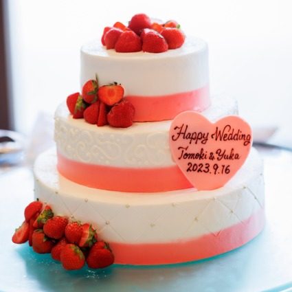 披露宴会場の装飾はもちろん、ウエディングケーキもシェフとの打合せを経て大変可愛いケーキを作っていただき大満足でした。