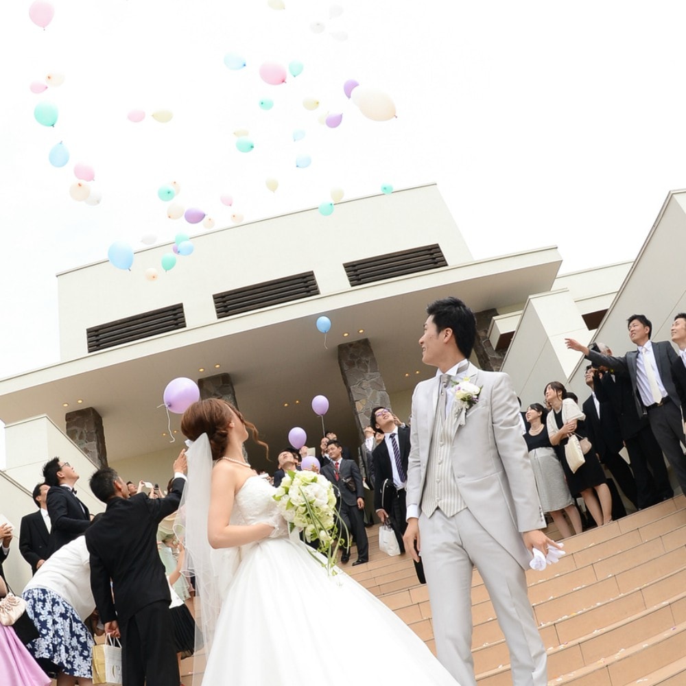 →女性はブーケトスがありますが、男性にも楽しんでもらいたい♪という想いからバルーンリリースは男性ゲスト中心に参加してもらいました。また、当日のサプライズで子供達の名前を呼んでもらい、新婦からバルーンを渡し一緒に飛ばしました。