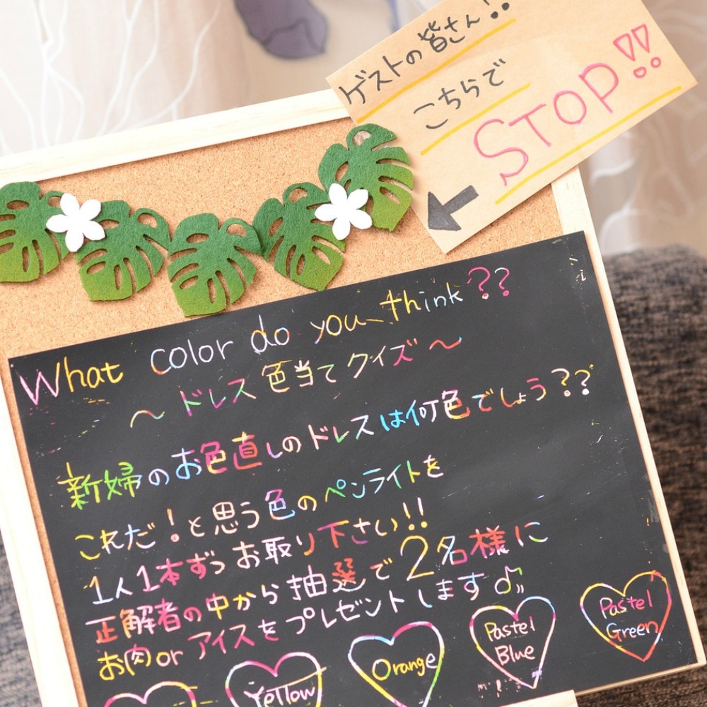 当日、控え室に入ると、プランナーさんやキャストの皆様からのメッセージ色紙のプレゼントをいただきとても嬉しく、感動しました。また、新婦の靴のサイズが合わず足が赤く痛くなってしまうことがありましたが、それもすぐにサポートしてくださいました。挙式や披露宴では、打合せと違うことが次々と起きてしまったり、ウェルカムコーナーが壊れてしまったりなど、たくさんのハプニングがあったのですが、それもすぐに私たちに伝えてくださり、スムーズかつ丁寧に対処してくださったのでとても助かりました。