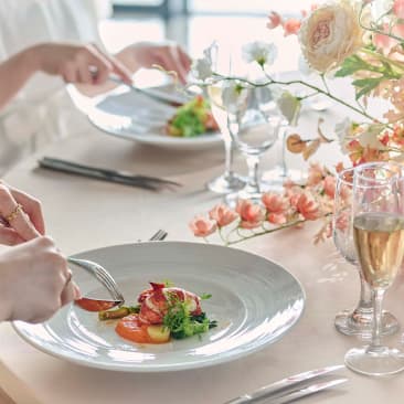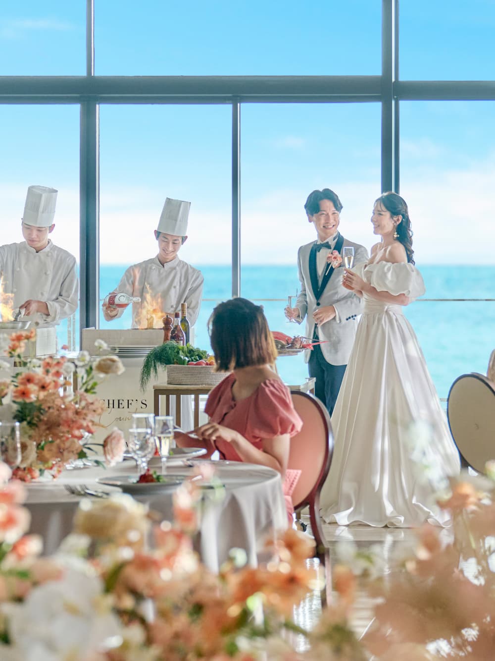 目の前に海が広がる贅沢なロケーションは、ゲストの皆さまに喜んでいただける特別なおもてなしに。陽光がきらめくデイタイムから茜色に染まるサンセットへと、時間によって刻一刻と変わる風景が、パーティーをドラマチックに彩ります。窓の外にはテラスもあり、潮風や波の音を感じながらの演出もお楽しみいただけます。