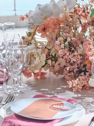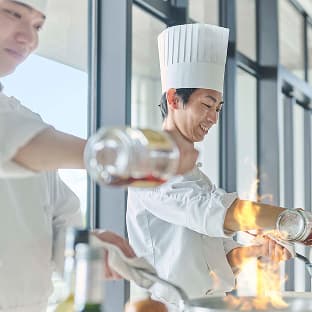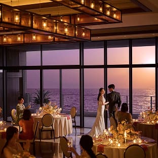 ブラウンを基調とした「LAULEA(ラウレア)」は、あたたかみのある上質なバンケット。木をあしらったモダンなシャンデリアなど、こだわりのインテリアで邸宅のようにゲストをお迎えすることができます。美しいオーシャンビューをバックに、心に残る最高のひと時をお過ごしください。