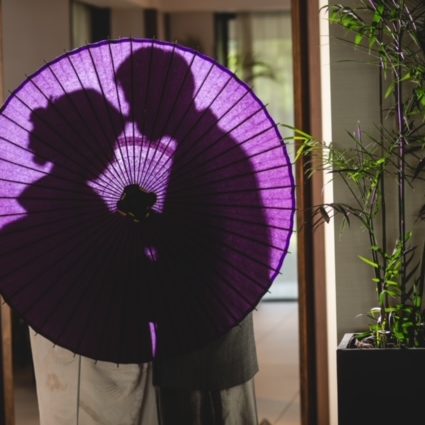 番傘を使用したシルエット撮影やラウンジテラスでの和装前撮り