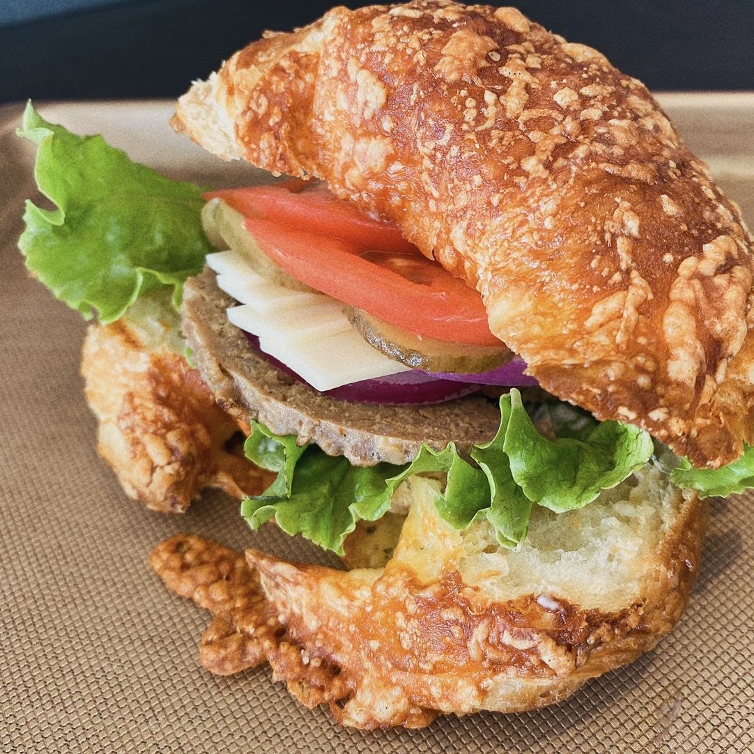 クロワッサンを丸く焼成し、焼成時チーズをのせて焼き上げて生地を作ります。