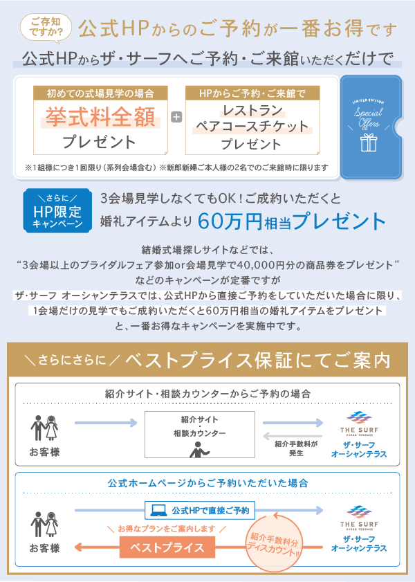 他の式場紹介サイトや式場紹介デスク・相談カウンター経由にてご予約をいただく場合よりも