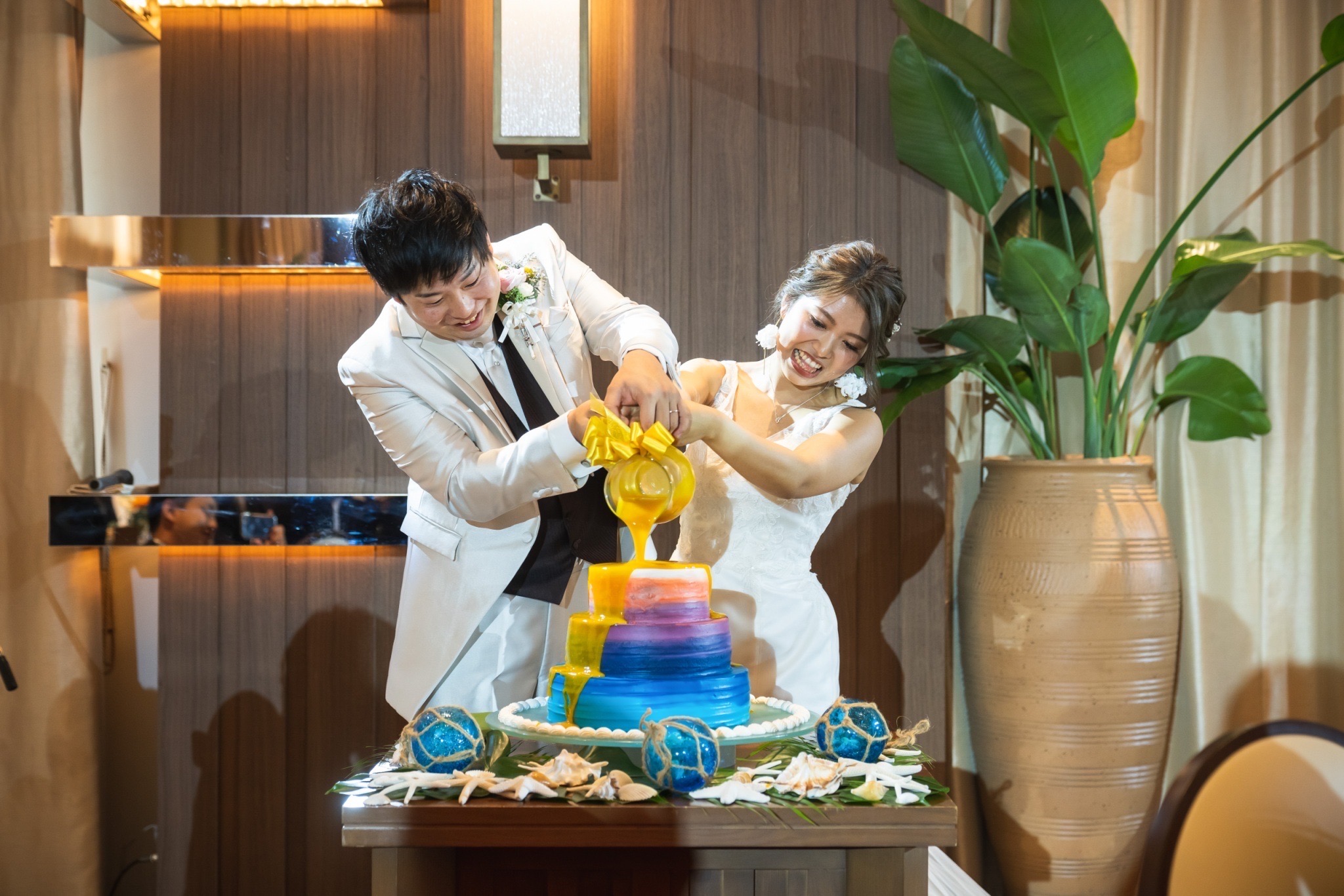 王道のケーキ入刀ではなく、上からシロップをかけて完成させる演出。