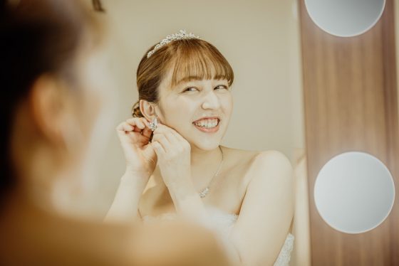 鏡の前でドレスアップをして微笑む新婦様の笑顔は