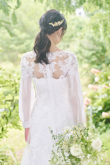 バックスタイルも袖がチュールになっているため