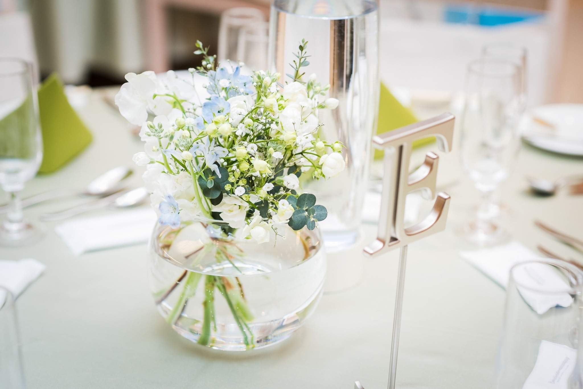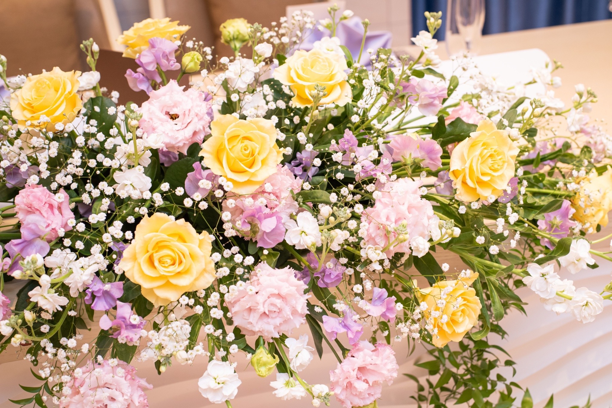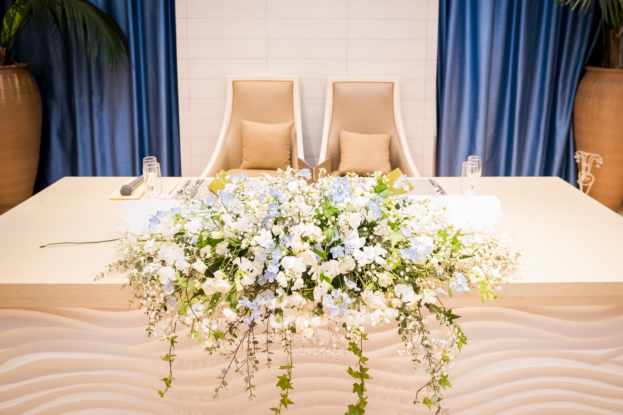 卓上装花にもさわやかな配色を採用♪