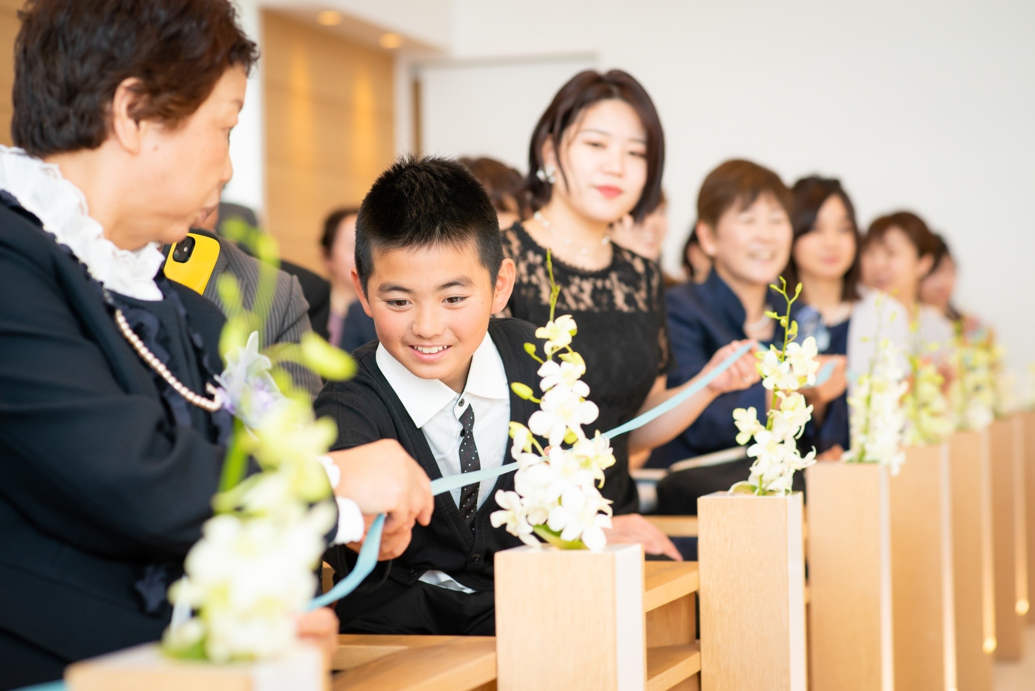 ゲストの椅子(バージンロード側)にあらかじめリボンをご用意。