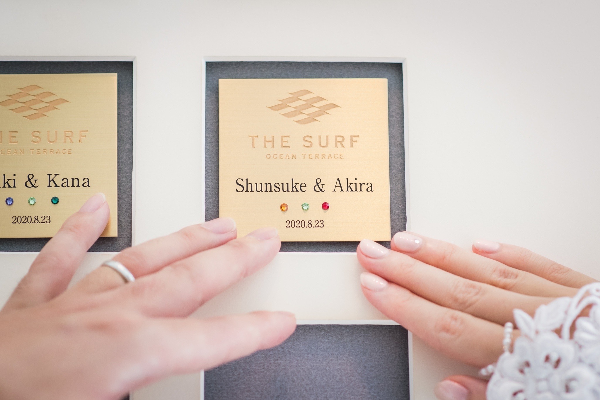 サーフの挙式では、お二人の名前と挙式日が彫られた