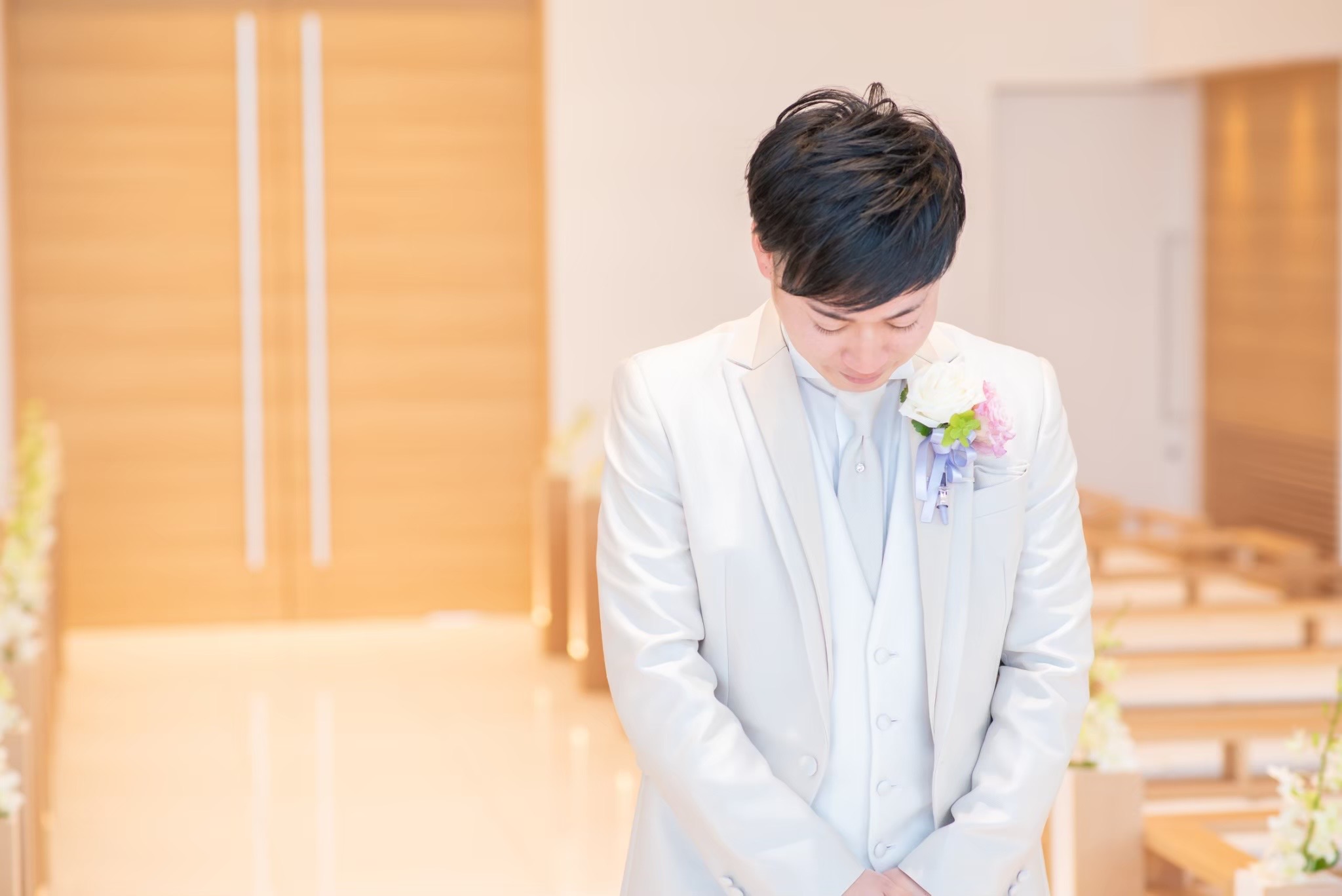 神妙な面持ちで、新婦様の入場を待つ新郎様。