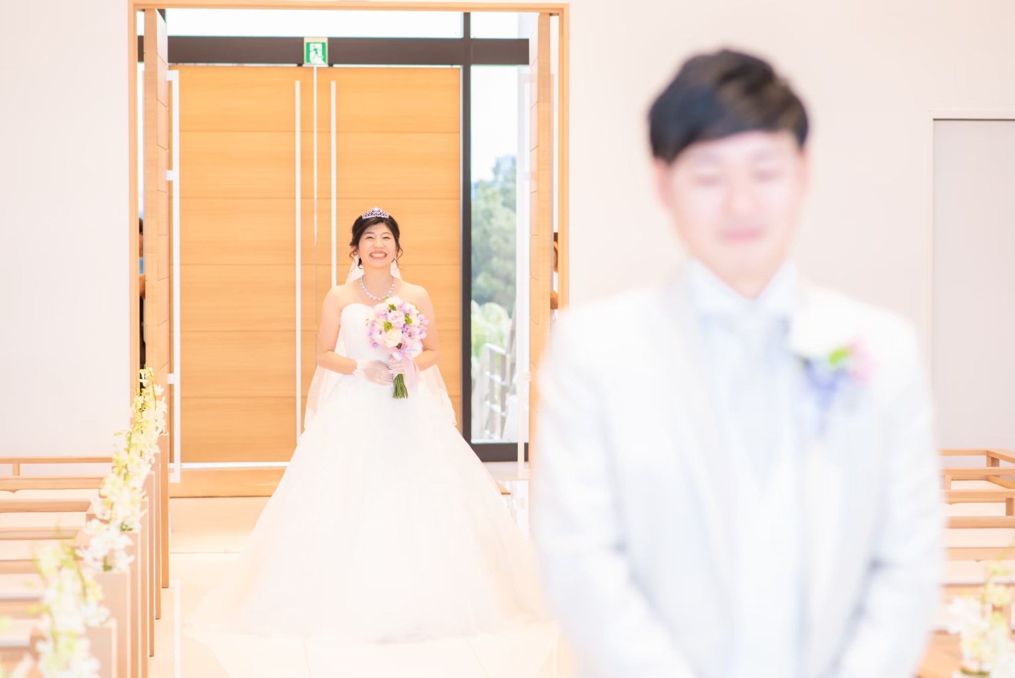神妙な面持ちで、新婦様の入場を待つ新郎様。