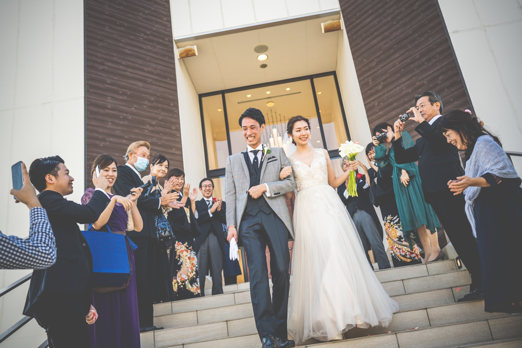 ゲストの皆様が新郎新婦様に花びらをかけ