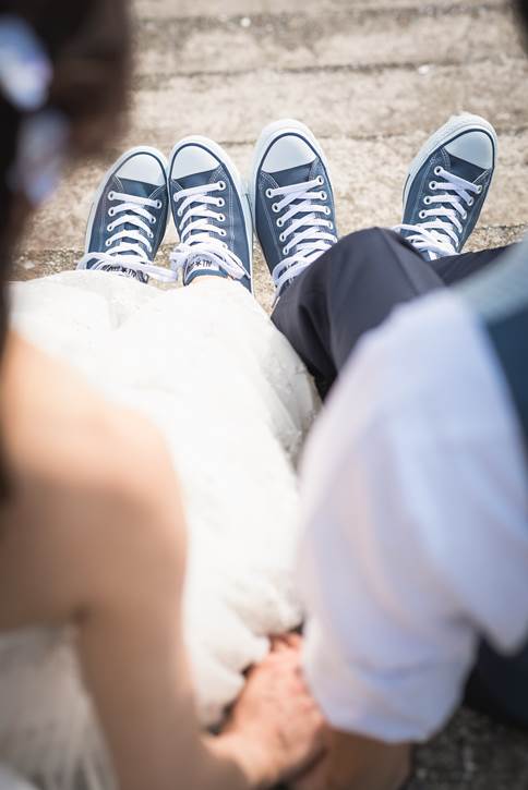 最近流行のおそろいアイテムでのお写真! カップルや友人同士で靴やTシャツ、小物を揃えて街を歩いたりするの...
