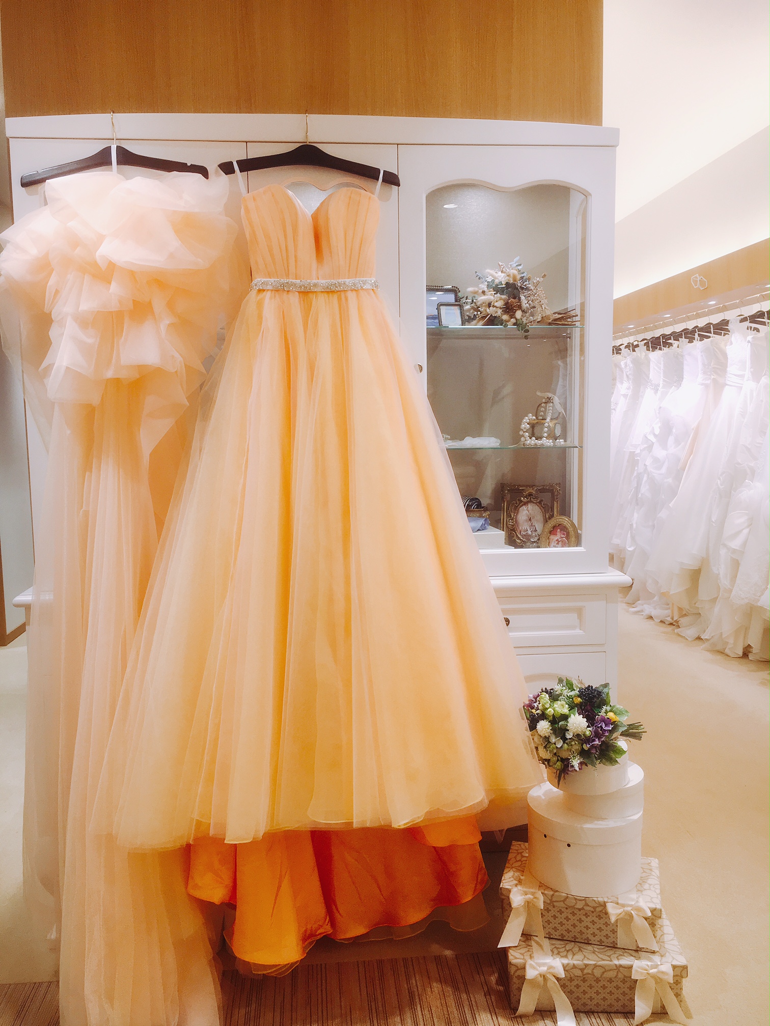 ドレスサロンに新たなカラードレスが仲間入り致しました! オレンジ、イエロー、ピンク、3色のチュー...