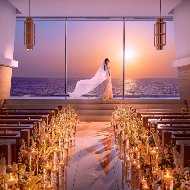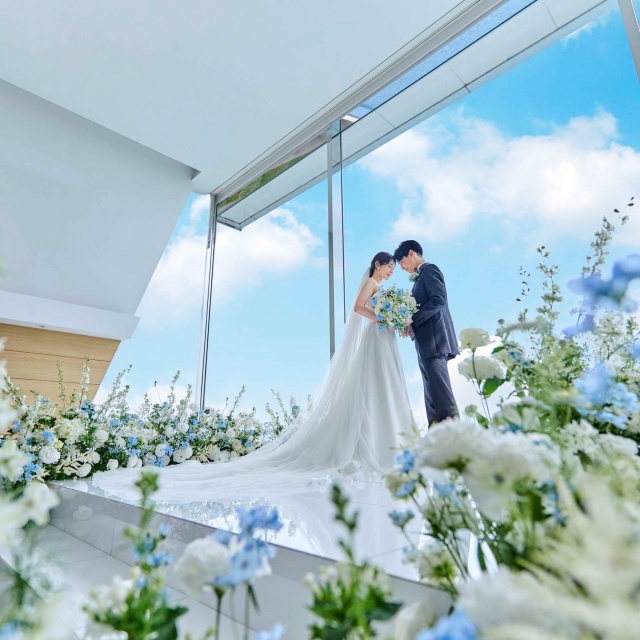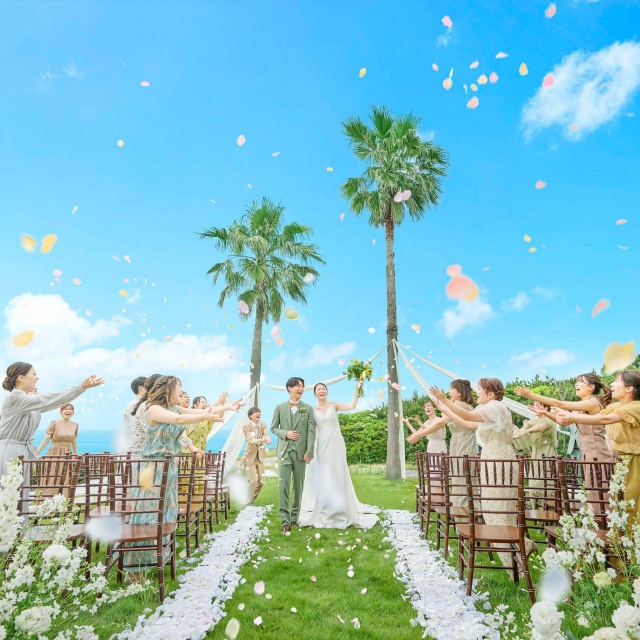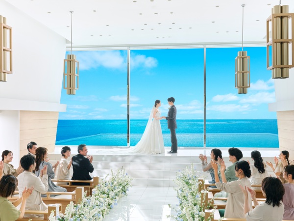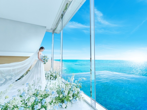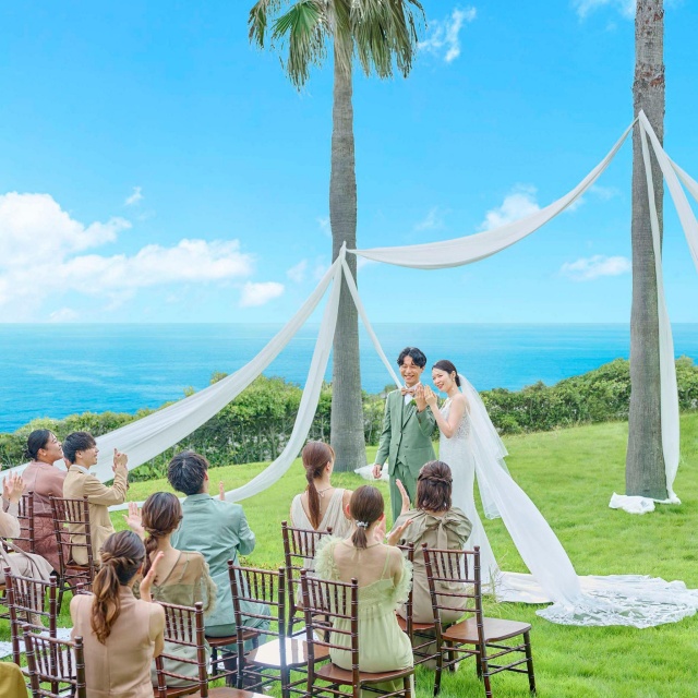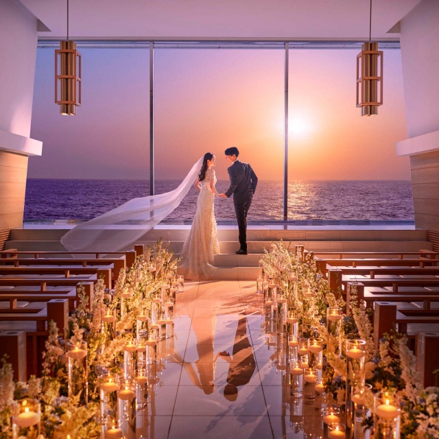 祭壇の先に広がるのは、パノラマサイズの圧倒的なオーシャンビュー。遮るもののない水平線が続く感動的な光景は、おふたりの誓いの瞬間をより一層輝かせます。また、夕焼け色に染まるサンセットビューも格別の美しさ。刻一刻と表情を変える光と景色に包まれた、ドラマチックなセレモニーが叶います。