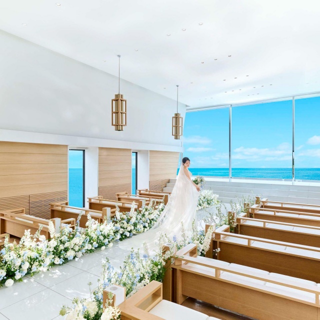 ホールは美しい海と空、そして主役のおふたりが映える、白を基調としたピュアでスタイリッシュな空間です。ナチュラルな木目調のあしらいが、誓いの場に優しいぬくもりを添えてくれます。ホールではキリスト教式をはじめ、ギター演奏を取り入れた人前式などオリジナル感あふれる挙式を執り行えます。おふたりらしい自由なコーディネートや演出をお愉しみください。