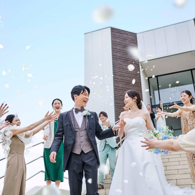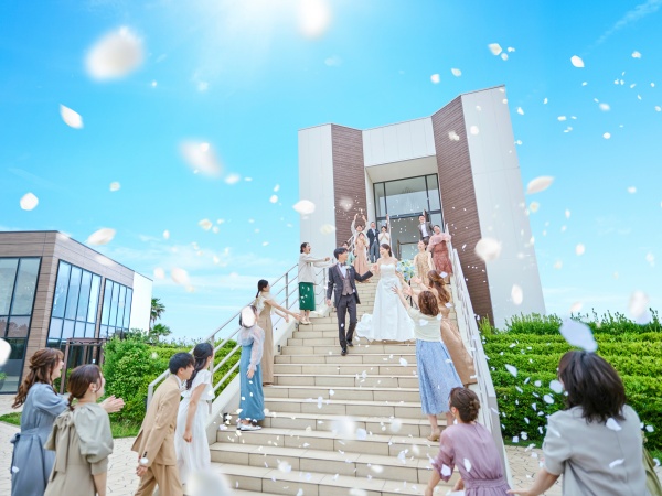 挙式後は、ホール前の大階段を使ったフラワーシャワーやブーケトスなど、華やかなアフターセレモニーをお愉しみいただけます。心地良い海風を感じながらゲストの方から祝福をうける、笑顔に満ちたひと時をお過ごしください。