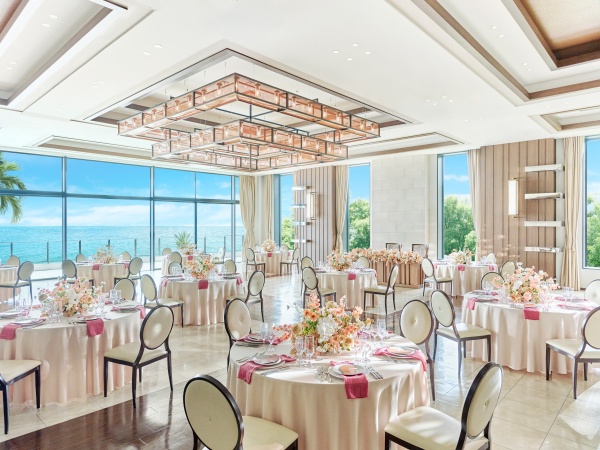 ドアを開けた瞬間、目の前に広がる一面のオーシャンビュー。ザ・サーフ オーシャンテラスでは、広大な海と空を目の前に愛を誓う、贅沢なセレモニーが叶います。美しい光景をそのまま映し出すスタイリッシュな空間は、式のテーマに合わせて自由な装飾や演出ができるのも魅力。すべての方の心に刻まれる、おふたりらしい誓いの時をお過ごしいただけます。