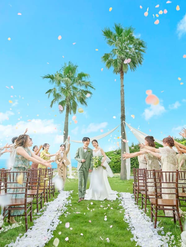 蒼く輝く海と空、そしてサンセットの美しいグラデーションが誓いの瞬間を彩る景色の中で
