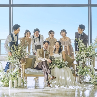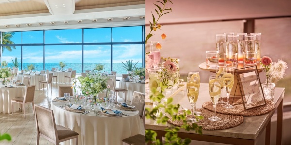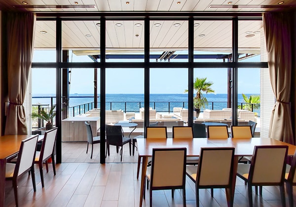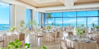白を基調としたバンケットLINO(リノ)は、優しい光が差し込む明るくナチュラルな空間。窓から見渡す美しい水平線の眺めと共に、会話の弾むカジュアルで楽しいパーティーを演出いたします。