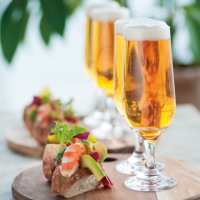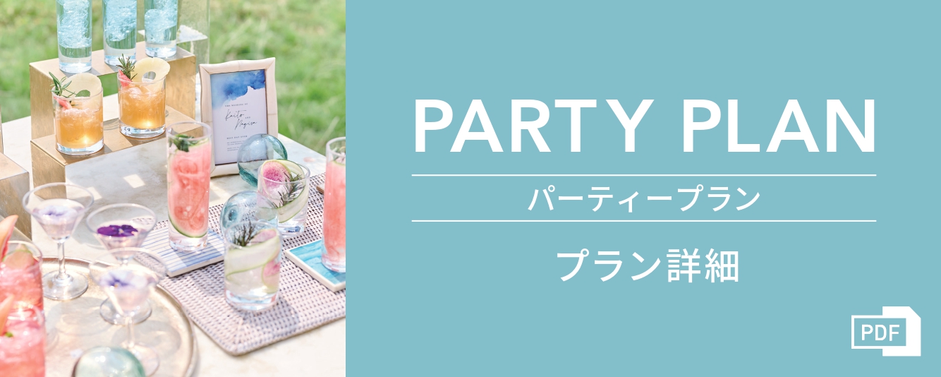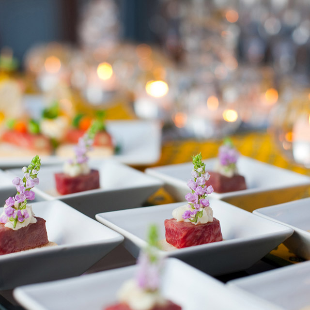 開放感あふれるパーティーに華を添えるのが、フレンチスタイルをベースに地産地消の食材を生かした料理の数々。宴会・パーティの様々な趣旨に合わせた、オリジナリティあふれるメニューをご提案いたします。また、パーティー会場には専用キッチンを併設しているので、一皿ひと皿を最も美味しいタイミングでご提供できるほか、お客様のご要望に合わせたフレキシブルな対応も可能です。