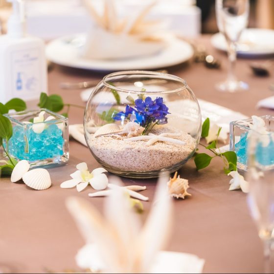 会場装飾や装花もブルーを入れてもらい、貝殻なども使用し