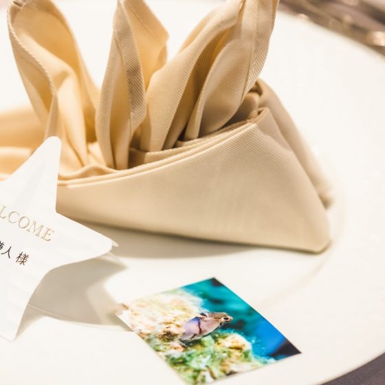 ナプキンも船の形にしてもらい、自分たちがダイビングで撮った写真に