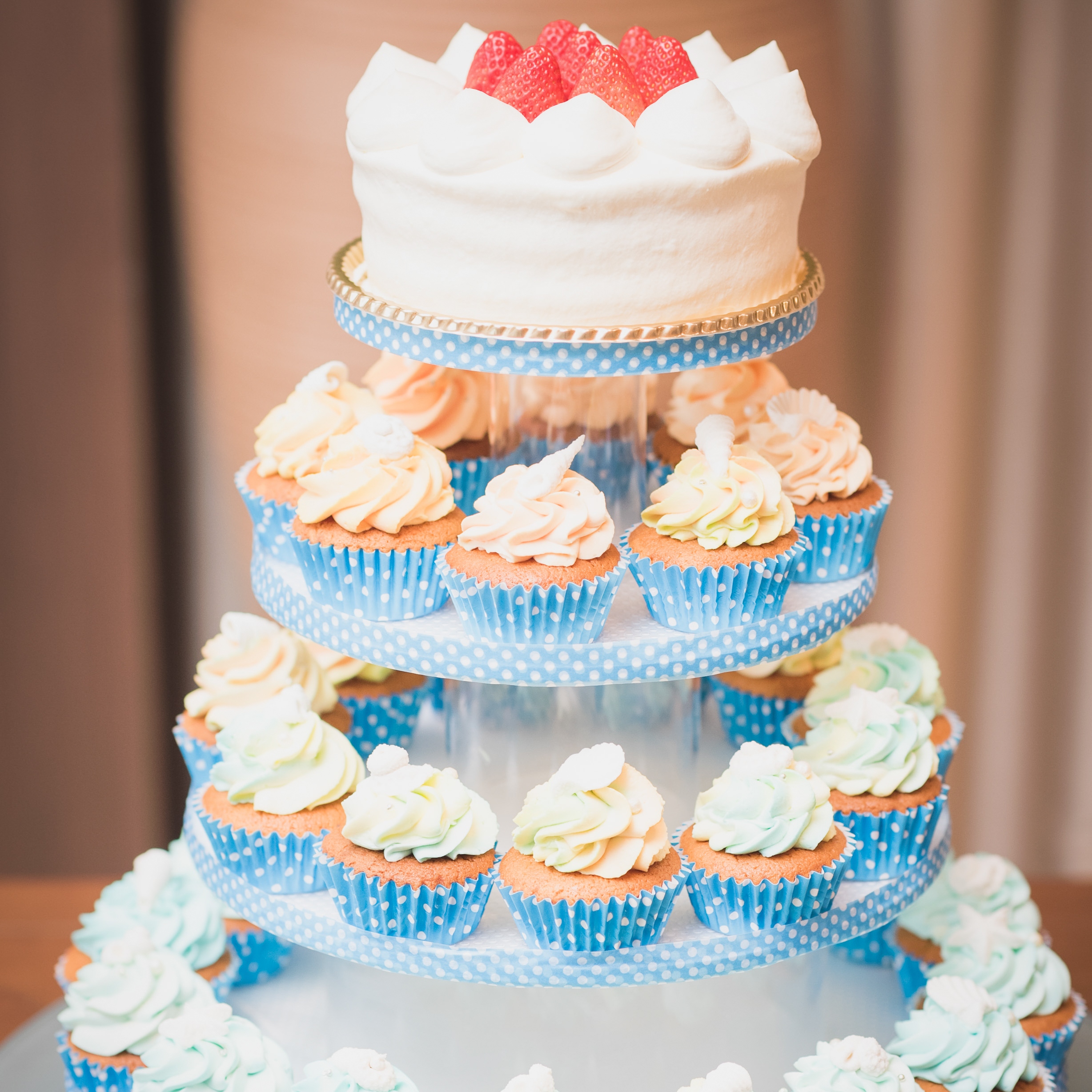 また、テーマのシェアハピにちなんでファーストバイトは大きいポッキーでポッキーバイトにしたり、ウェディングケーキはカップケーキタワーをオーダーしました!